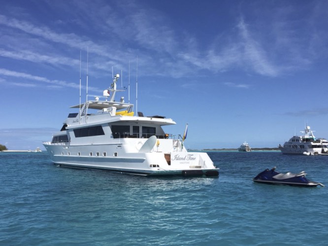 Island Time is a 110 ft raised-flybridge motor yacht that has an extensive history chartering in Bahamian waters. After a significant refit in early 2018 she is as luxurious as ever and is the ideal yacht for an extravagant day in the turquoise sea of the Bahamas. She was engineered, manufactured, and had her interior designed by Broward Shipyard in Dania Beach, FL.