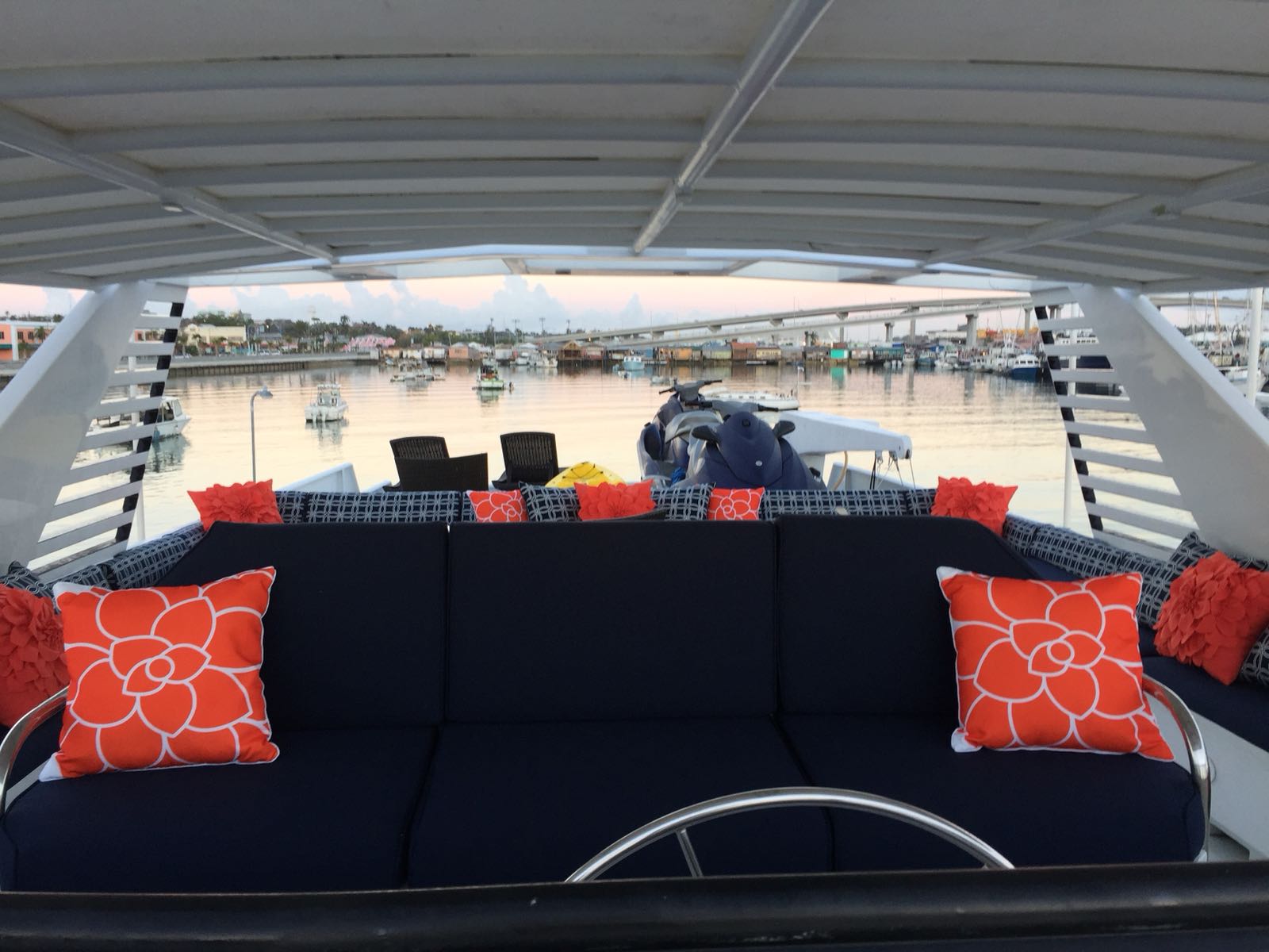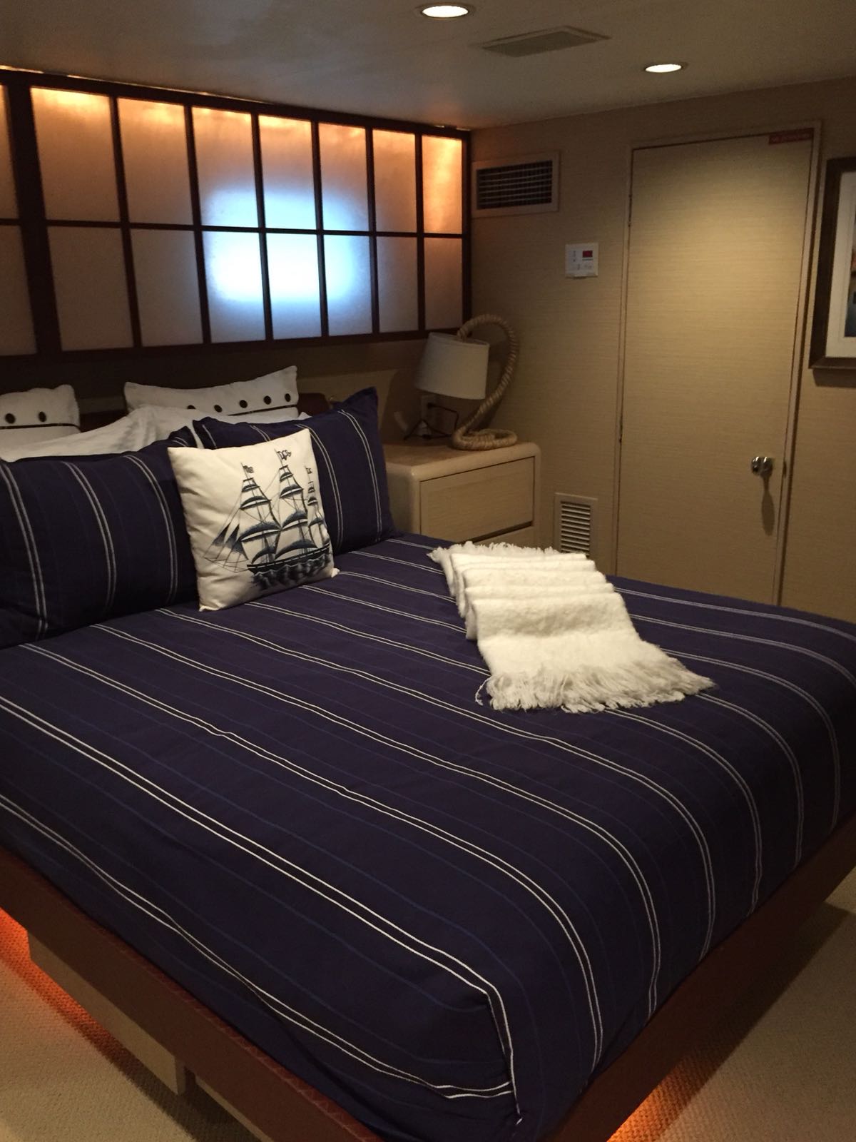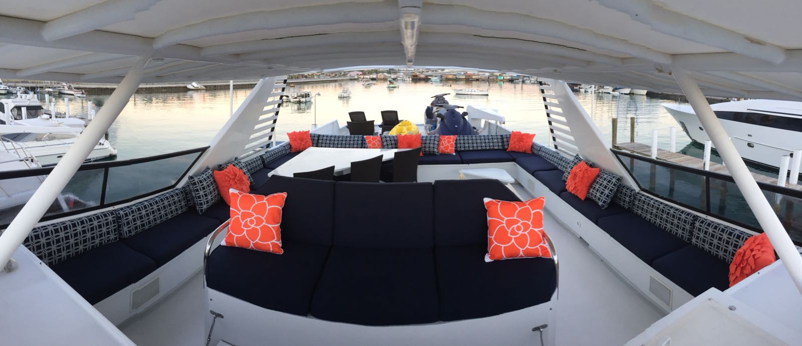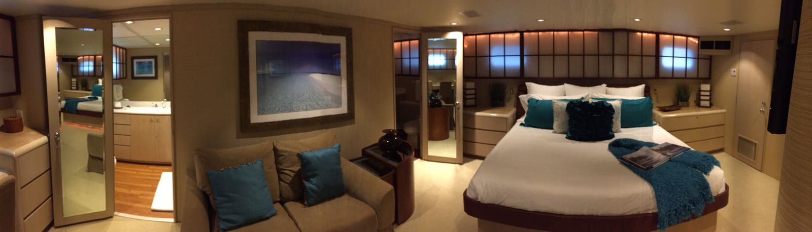 Island Time’s interior sleeps up to 10 guests in 4 rooms, including a master suite, a VIP stateroom, 1 twin cabin and 2 pullman beds. On day charters, she is licensed to carry 15 guests – ideal for larger parties. She runs with 4 crew comprised of Captain, 1st Mate, Stewardess and Chef, who all work tirelessly to ensure a comfortable and elegant trip wherever you decide to cruise. Amenities onboard include an aft deck jacuzzi, 2 jet skis, paddle boards, kayaks, wakeboard, towing tube, scuba diving equipment, and a 25 ft Cobia tender outfitted with fishing and snorkeling equipment.